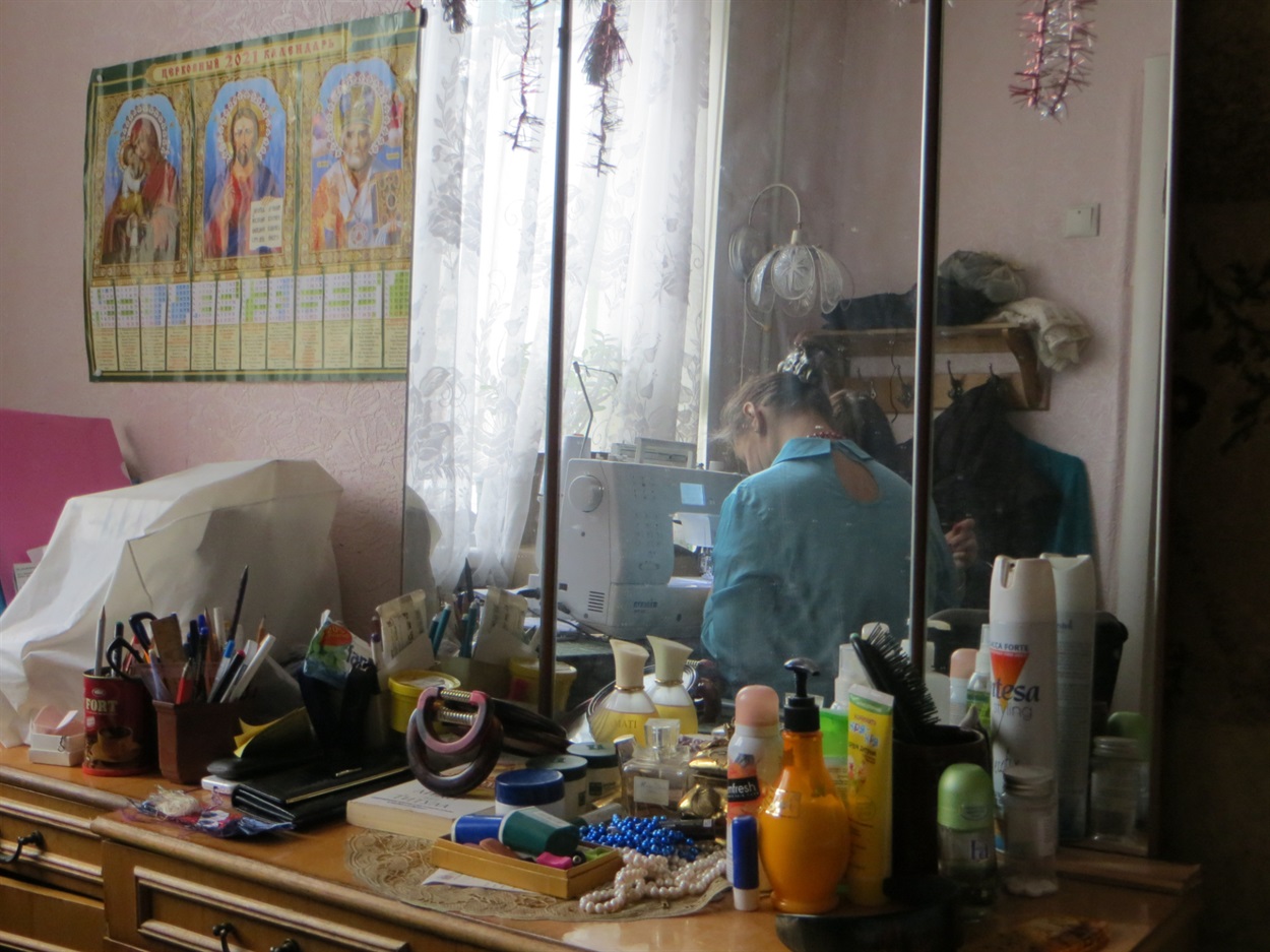 Обстановка в квартире очень скромная, мебель 60-70 годов прошлого века. На ее фоне выделяется ноутбук, немецкая машинка Minerva, два манекена и повсюду карандаши в подставках. В зале у окна специально оборудованное место для рисования, а швейная мастерская расположилась в комнате, которая служит одновременно и спальней.