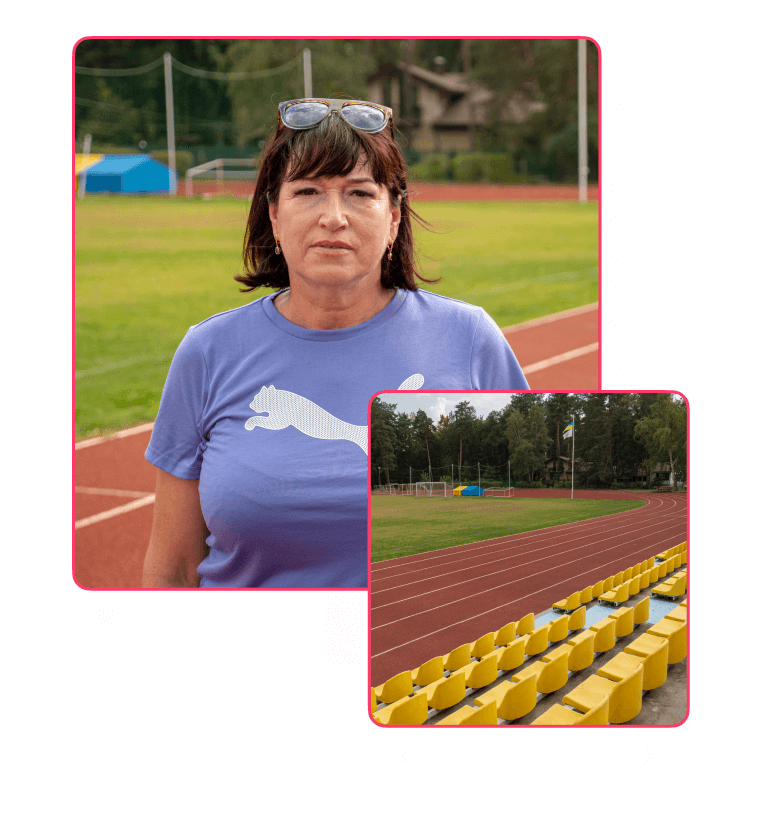 Бачите, неймовірний краєвид зі стадіону! Кожного ранку я прокидаюсь о 7 мій годині та роблю зарядку, бігаю по стадіону, а вже потім планую справи, займаюся громадською діяльністю - є віце-президенткою федерації легкої атлетики Луганської області. До 2014 року ми жили та працювати, ростили доньок у Луганську. А у зв'язку з військовими діями перебралися сюди, у Кремінну, на запрошення директора бази “Олімп”. Тепер ми тут живемо, працюємо, розвиваємо легку атлетику. Збірні, які приїжджають, від'їжджають з бази практично всі з особистими рекордами і поліпшеними результатами, а привозять - медалі. Це дуже приємно, це найкраща подяка. Ми намагаємося постійно покращувати і розвивати інфраструктуру - плануємо більше житла, більше відновлювальних центрів, тренажерні зали. Я вважаю, що у великому спорті ледарів немає. Як і будь-який інший роботі, в спорті важливо робити все відповідально і на совість.