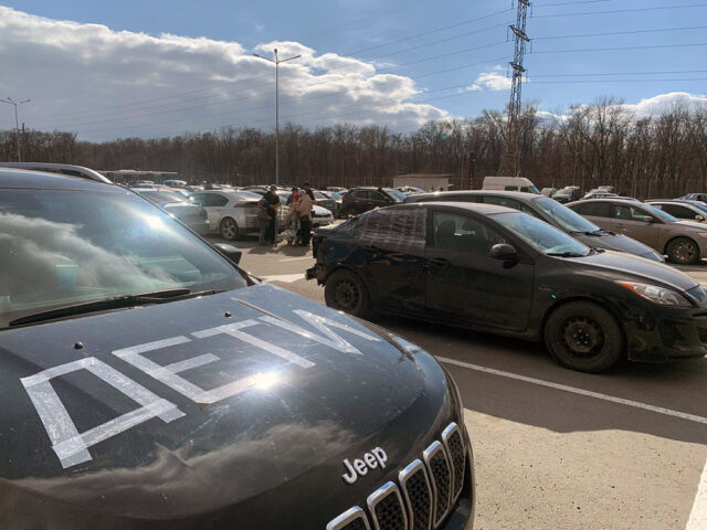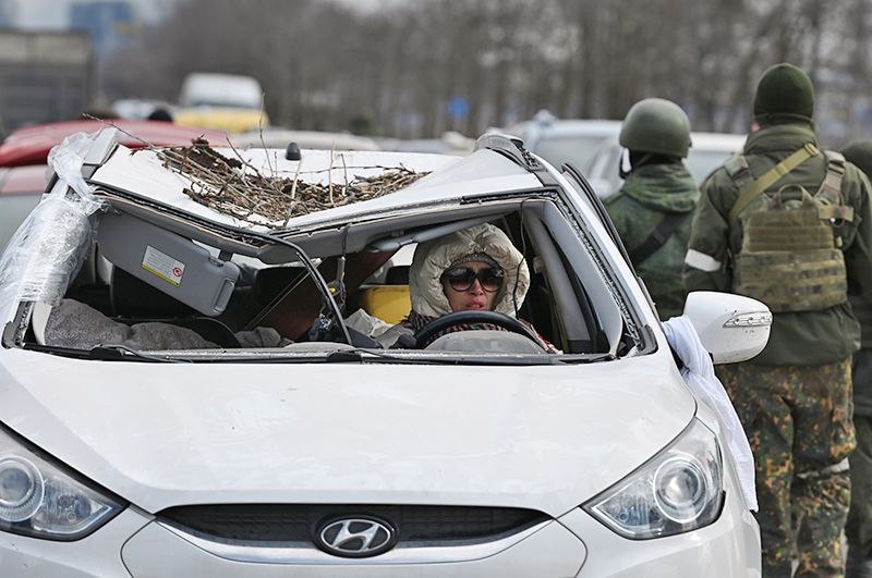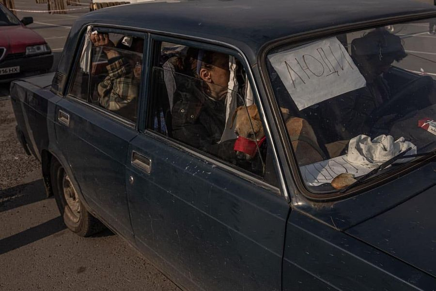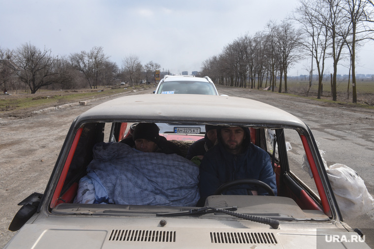 Жители Мариуполя, рискуя жизнью, выбирались из блокадного города на автомобилях. Часто в них нет стекол, поврежден осколками и выстрелами кузов. На многих - надпись "Дети" и белые флаги.
