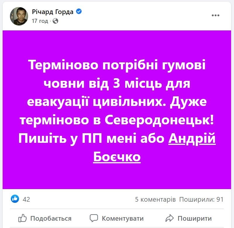 Сейчас, что бы эвакуировать людей волонтеры идут на крайние меры. В Фейсбуке они просят людей отыскать им резиновые лодки для переправки людей через Северский Донец. Помочь тут.