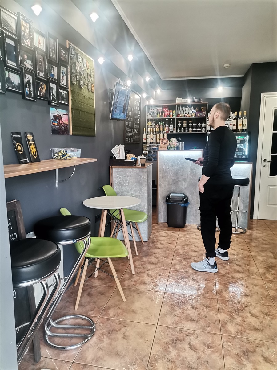 Це невеличке приміщення площею 20 “квадратів”, де одночасно можуть розміститися до 10 гостей. На полиці стоять розмальовані зенітні набої, на стінах розвішані прапори “Азову” і світлини в рамках — на них “Бас” на службі в різних підрозділах, починаючи з 2014 року. А ще стенд з шевронами і картина, на якій зображений гелікоптер з прибулими в Маріуполь добровольцями. Також можна безкоштовно взяти патріотичні браслети на згадку про відвідування кав’ярні.