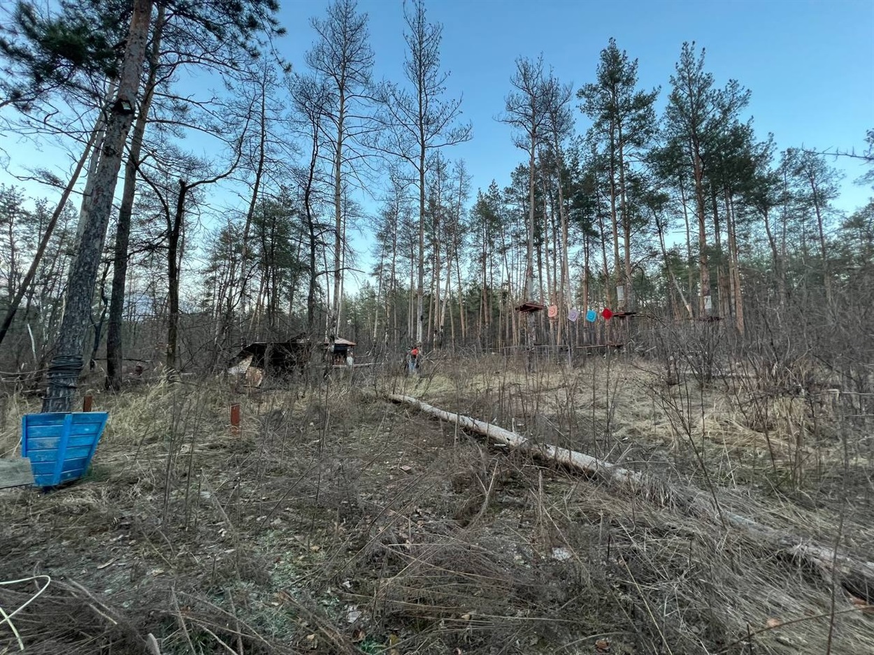 На деревах висять залишки канатів. Трохи далі — маленький дерев’яний замок та пісочниця. Від кафе не лишилось зовсім нічого. Тільки купи металу, дерева та мотлоху. Ігор показує, як воно виглядало раніше.