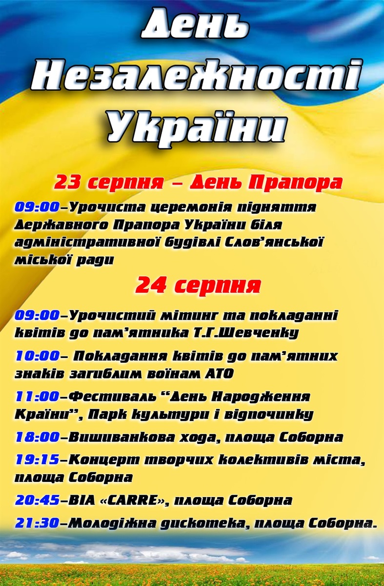 24 августа в разных локациях города пройдут митинг и возложение цветов к памятнику Тарасу Шевченко, фестиваль «День народження країни», возложение цветов к памятникам воинам АТО, второй городской фестиваль «Славянский парад вышиванок», концерт, молодежная дискотека.