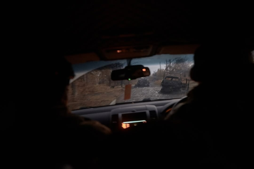 Навколо спалені автіки, колючий дріт і військові, які прислухаються до кожного дзижчання