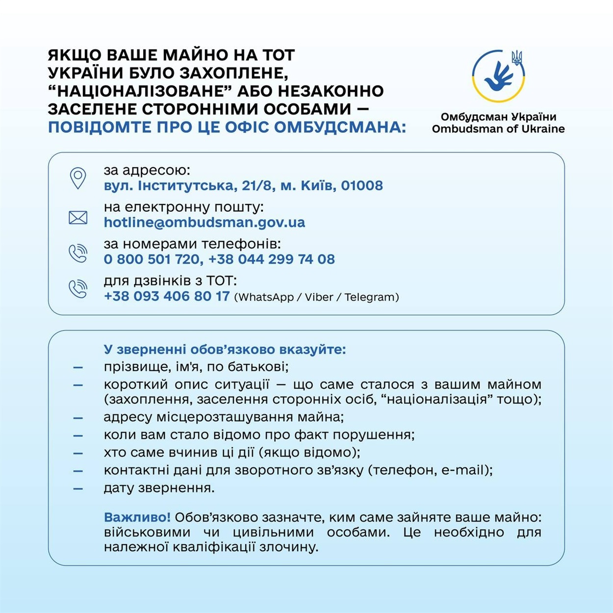 Звернення до омбудсмана варто подати у трьох випадках: якщо окупаційна адміністрація націоналізувала ваше майно, якщо у вашій квартирі чи будинку незаконно оселились сторонні люди, а також якщо власність відчужили або переоформили без вашої згоди.