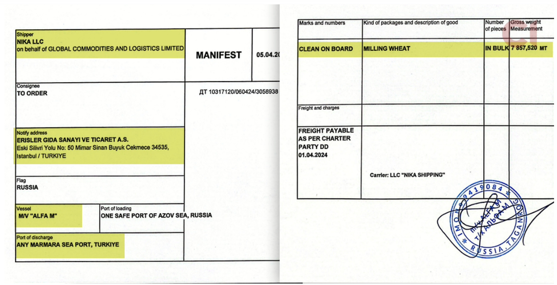 У документі вказано, що російське судно Alfa M, яке з листопада 2023 року перебуває під українськими санкціями, відправило 7,857 тис. тонн пшениці в російський порт Темрюк у Краснодарському краї, на узбережжі Азовського моря. І вже звідти, відповідно до даних із митниці РФ, товар відправився в Туреччину. У вантажній декларації від 6 квітня 2024 року вказано, що вантаж вийшов із Маріуполя, який назвали не українським, а російським містом. Так краденe зерно набуває «законного» вигляду на папері. Згідно з морським маніфестом, який є у розпорядженні журналістів, «Ника» відправила цю партію від імені компанії «Global Commodities» турецькій компанії «Erisler Gida Sanayi Ve Ticaret A.S.».