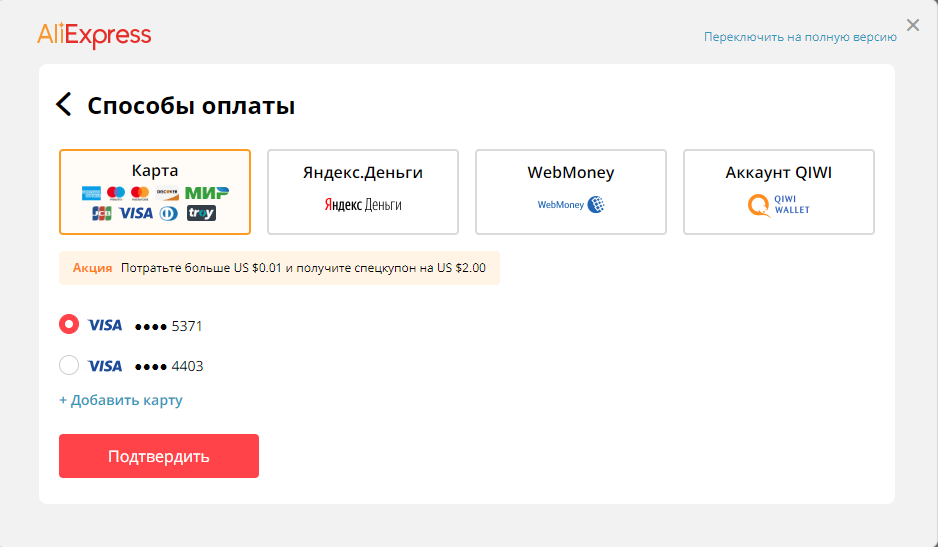 Торговая площадка AliExpress также принимает оплату через другие сервисы: WebMoney, Western Union, Яндекс.Деньги, QIWI, DOKU, MercadoPago, Boleto, American Express. Но в таком случае деньги переводятся напрямую на аккаунт продавца, и если возникнут проблемы, разбираться придется самостоятельно.